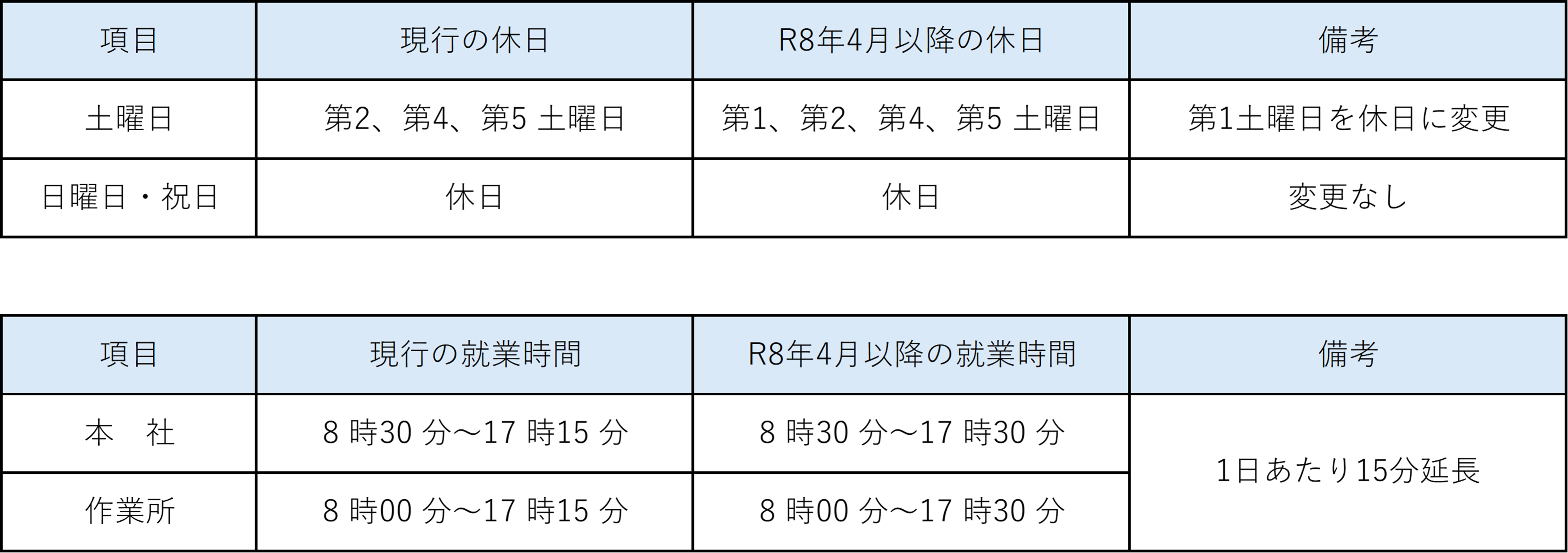 休日および就業時間を下記のとおり変更することといたしました。